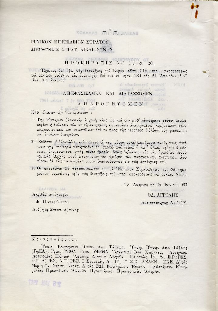Section of the proclamation of the General Staff of the Army prohibiting the distribution and circulation of books, magazines, and newspapers as communist and dangerous for youth. June 1967. General State Archives of Greece, Central Service, Archive of the General Secretariat of Press and Information. Τμήμα της προκήρυξης του Γενικού Επιτελείου Στρατού με την οποία απαγορεύεται η διάθεση και κυκλοφορία βιβλίων, περιοδικών και εφημερίδων ως κομμουνιστικών και επικίνδυνων για τη νεολαία. Ιούνιος 1967. Γενικά Αρχεία του Κράτους της Ελλάδας, Κεντρική Υπηρεσία, Αρχείο Γενικής Γραμματείας Τύπου και Πληροφοριών