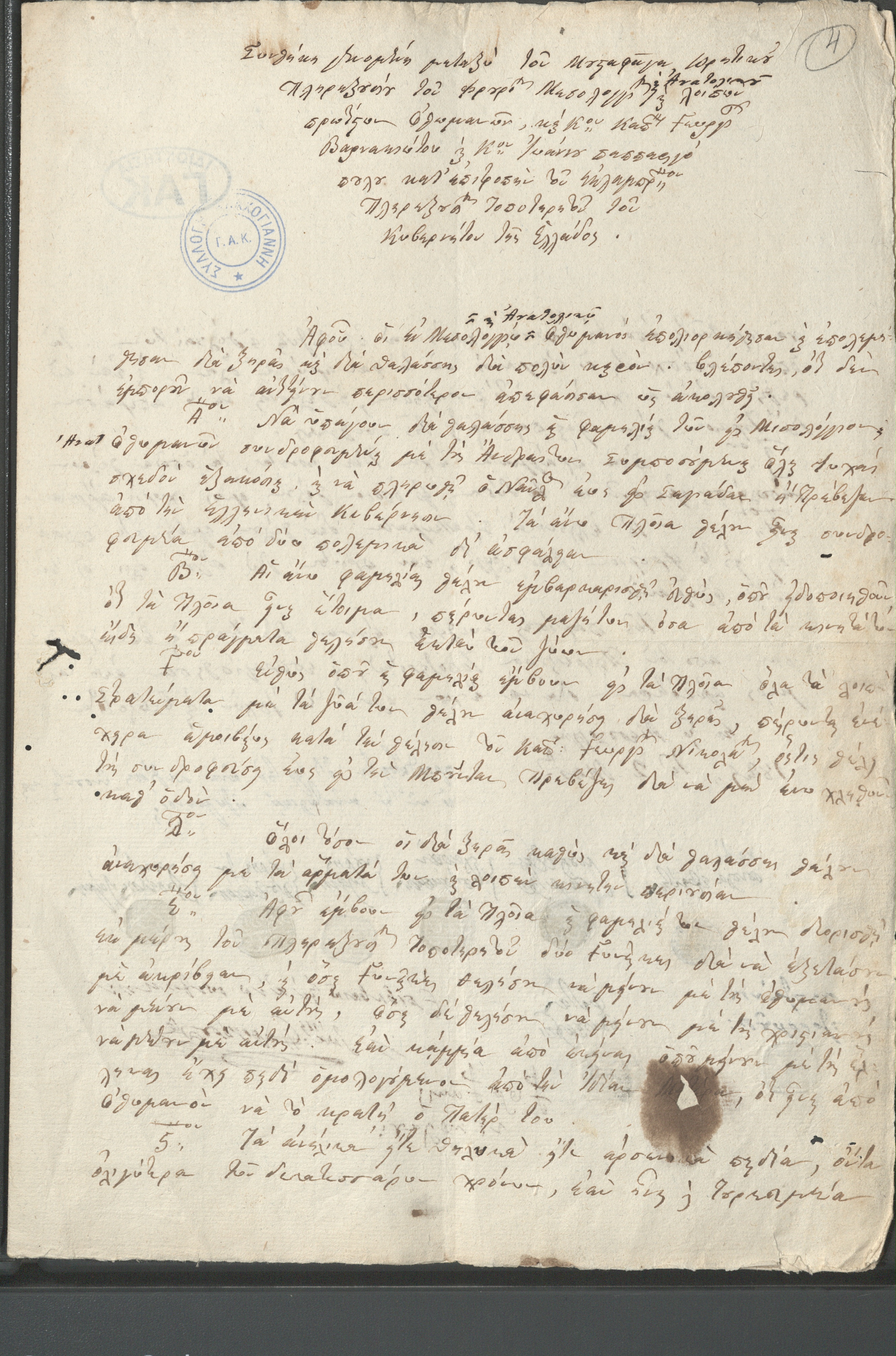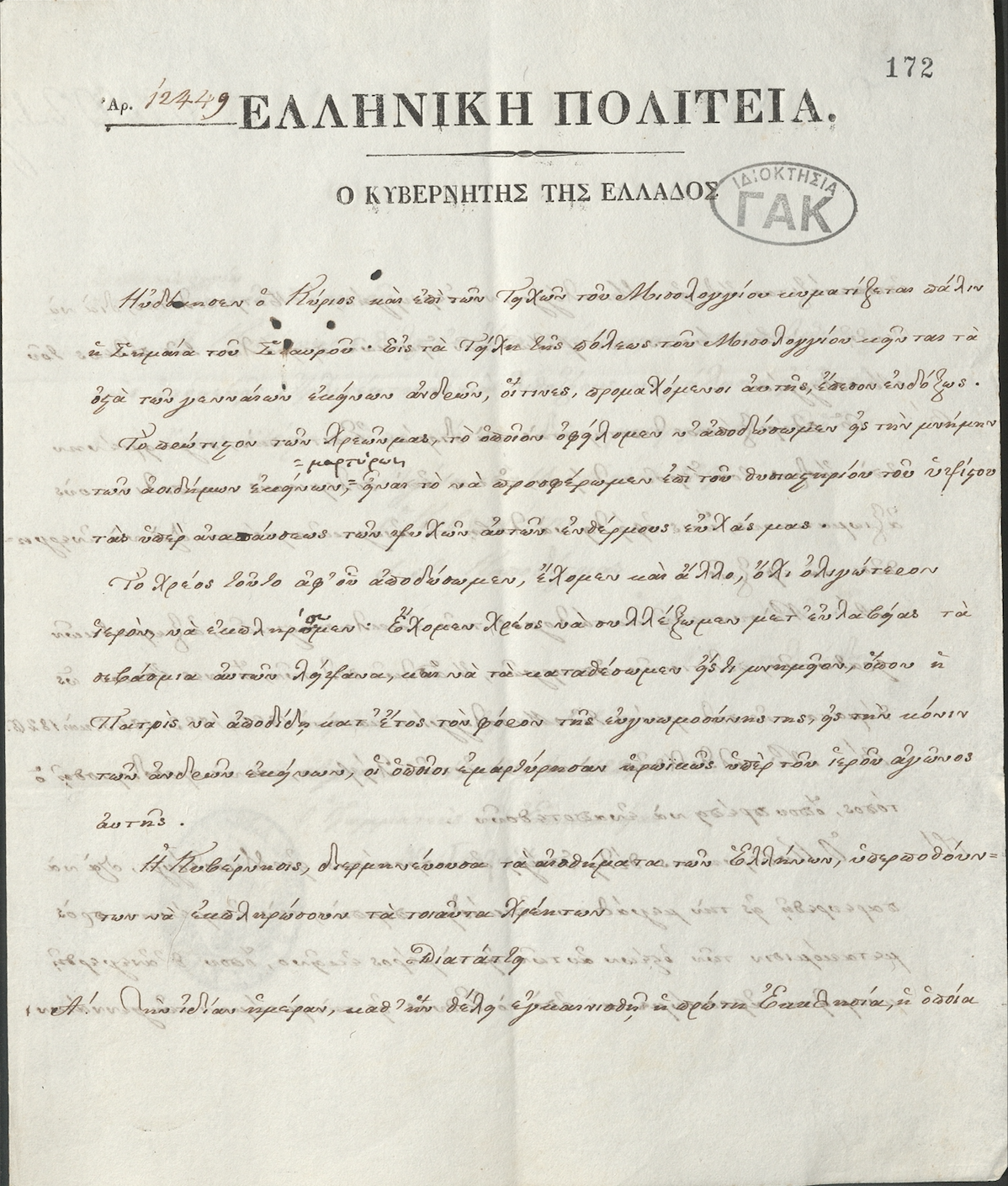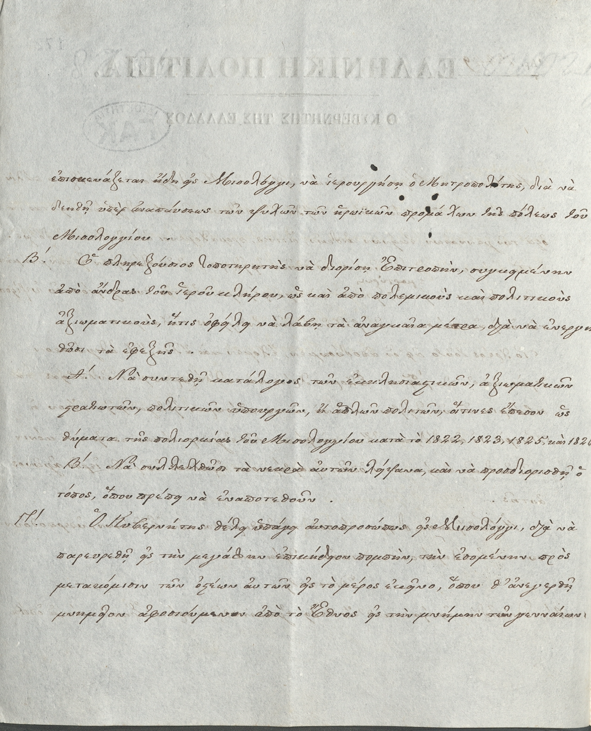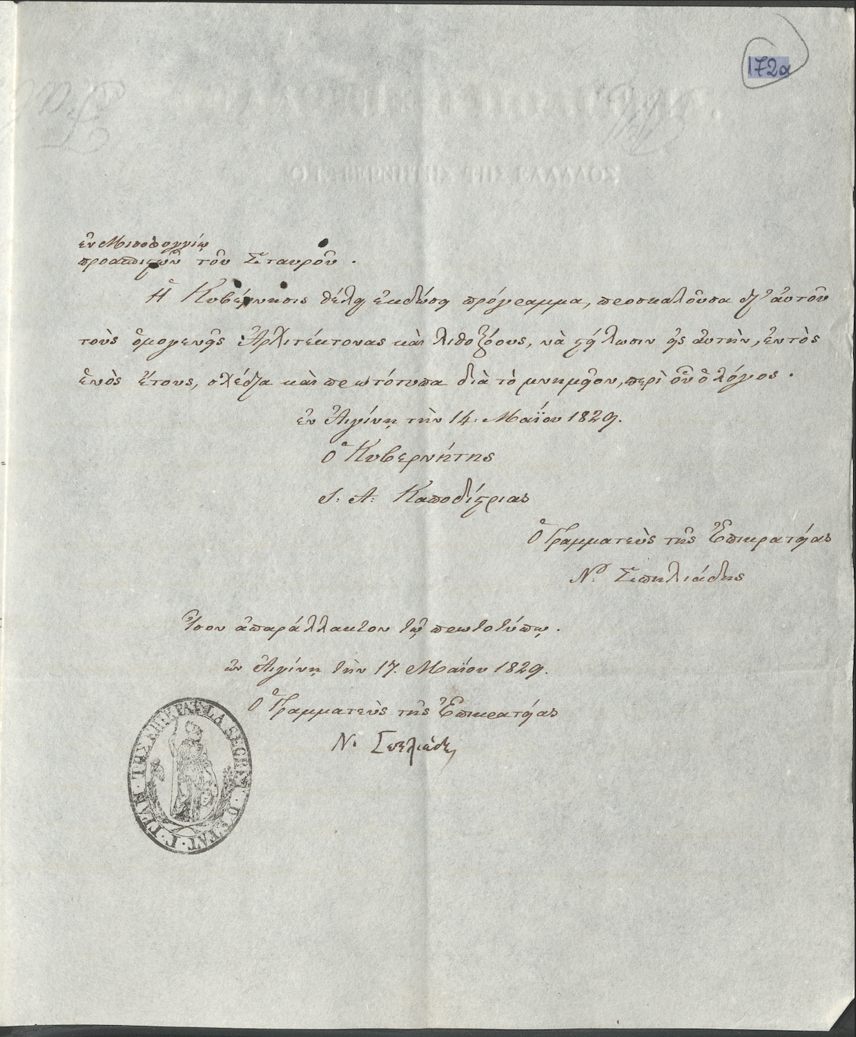 Decision No. 12449 by Ioannis Kapodistrias concerning: a) The celebration of a memorial service for the repose of the souls of the heroic defenders of the city of Messolonghi; b) Compiling a list of victims of the siege of Messolonghi in 1822, 1823, 1825, and 1826.; c) Collecting the remains of the dead and determining where they will be laid to rest.; d) Visiting Messolonghi to attend the grand funeral procession.; e) Inviting fellow architects and stonemasons to submit designs for the monument to the heroes of Messolonghi. Aegina, May 14, 1829. GAK-Central Service, file of the Proxy Administrator, f. 6a