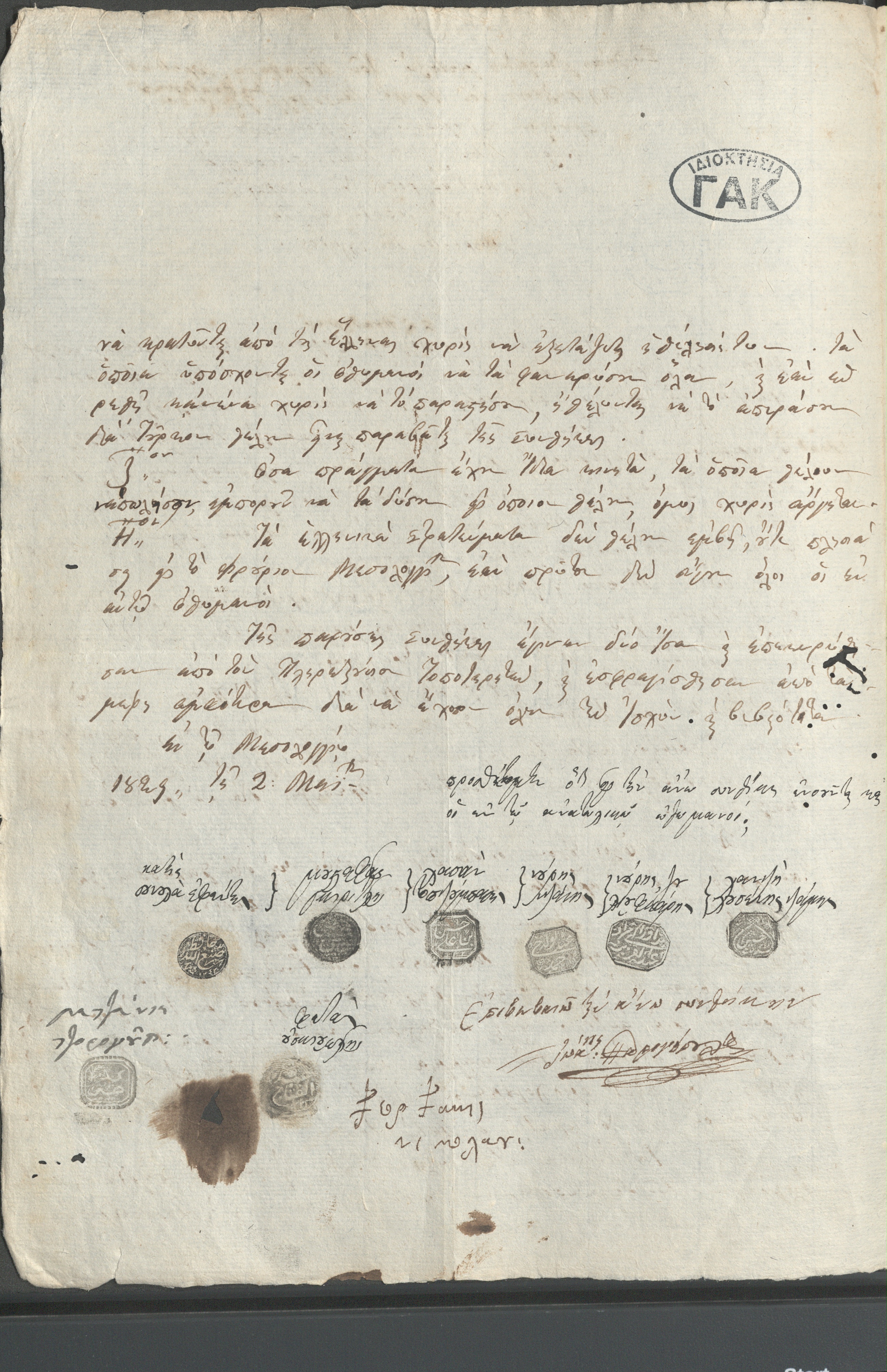 Treaty between Moustafaga, Cretan representative of the fortress of Messolonghi and Anatoliko, and Georgios Varnakiotis and Ioannis Paparigopoulos, with the terms of surrender of Messolonghi and Anatoliko. It bears the signatures and seals of the Ottomans. Messolonghi, May 2, 1829. GAK-Central Service, Vlachogiannis Collection, Catalog A, f. 118