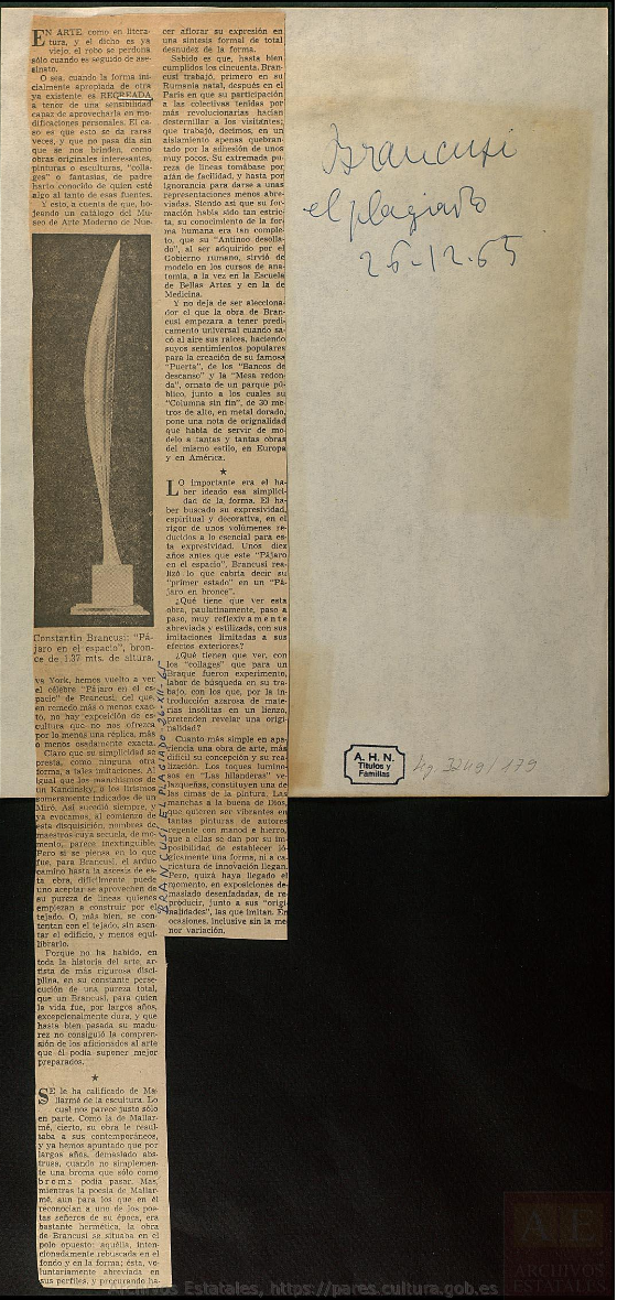 Brâncuși lived and worked across most of Europe and the United States, and his influence is truly global; here are papercuts on him from the Archivo Histórico Nacional, and the images from a 1976 personal exhibition in Paris, at the Musée de Luxembourg - you can find many collection on him in APE